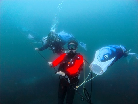あいにくの春らしい透明度のため、鯉のぼりは3匹見えるかな〜〜程度でしたが、しっかりカツオのぼりと一緒に写真撮影♪