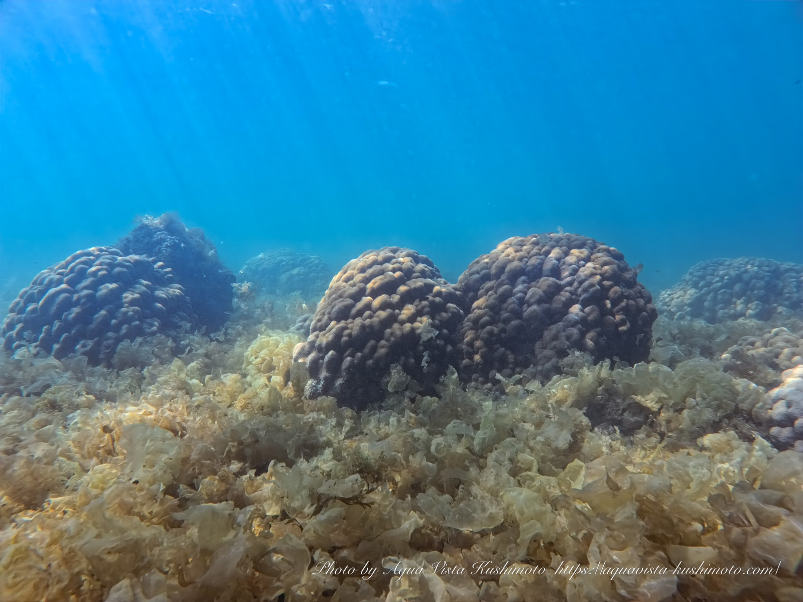 一面のフクロノリの中に佇むコブハマサンゴの山。