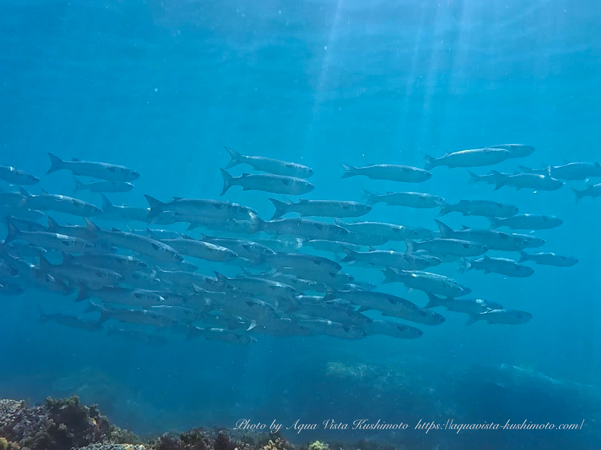 この後も続々とボラが泳いでいきました。これが串本の春の風物詩「ボラクーダ」です笑