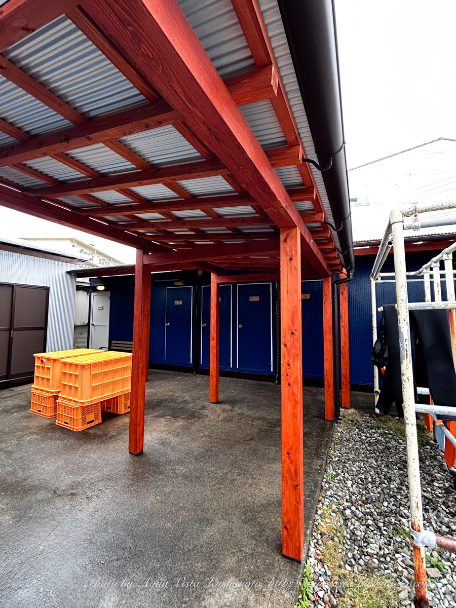 今までトイレやシャワーがある別棟と休憩スペースのある部屋の間に屋根がありませんでしたが、